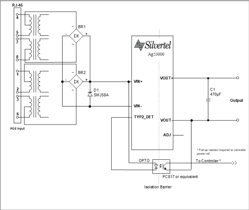 The Ag53000 is pre-configured as a Type 2 Class 4 PD device, requesting 30W of power from the PSE, with nominal output voltages of 12V or 24V.